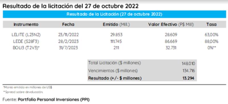 En cuanto a los plazos, la Lelite se emitió con fecha de vencimiento al 23 de noviembre, la Lede al 28 de febrero del año próximo y el T2V3 se emitieron al 31 de julio del año que viene. Todo vence antes de las elecciones de 2023.