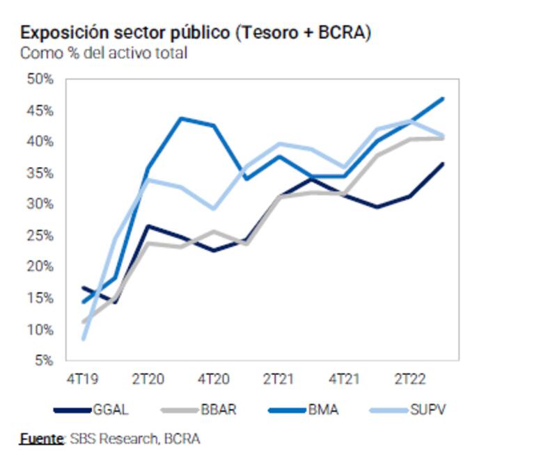 Según cálculos de Juan Manuel Franco, la exposición al sector público como porcentaje del activo, tomando un promedio de los cuatro bancos que poseen ADR, pasó del 13% en el cuarto trimestre de 2019 (inicio de este gobierno) al 41% en el tercer trimestre de 2022.
