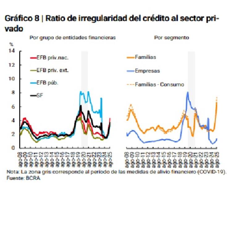 Según el Informe de Bancos publicado este viernes por el BCRA, el ratio de irregularidad del crédito al sector privado alcanzó 3,7% a nivel sistémico en agosto, aumentando 0,5 puntos porcentuales respecto al mes anterior. El indicador de mora de los préstamos a las familias totalizó 6,6%, mientras que para el financiamiento a las empresas se ubicó en 1,4% en ese período.