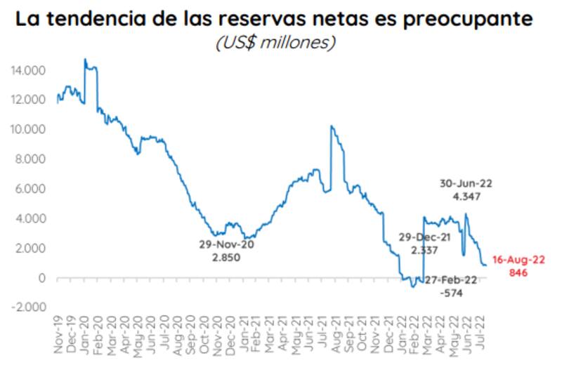 Actualmente las reservas netas se ubican en u$s 845 millones aproximadamente, lo cual implica un valor extremadamente bajo.