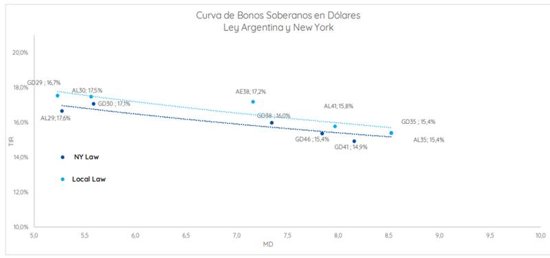 Las curvas de bonos de ley local y de ley internacional se muestran ambas con pendiente negativa y desplazadas al alza. La parte corta de la curva opera con tasas del 17,5%, como el caso del GD30 y el AL30. En la parte más larga, los bonos rinden 15% en promedio.