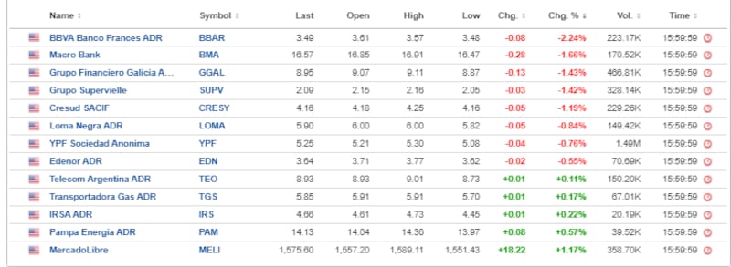 Entre las acciones que más caen se destacan BBVA Argentina, Banco Macro y Grupo Financiero Galicia que cayeron 2,25%, 1,66% y 1,4% respectivamente. Por su parte, del lado ganador se destacaron las acciones de Mercadolibre, Pampa Energia e Irsa que ganaron 1,1%, 0,57% y 0,22% respectivamente.