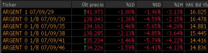 El tono de incertidumbre tambien se observa en la renta fija local, ya que la deuda argentina registra retrocesos en todos los tramos de la curva. La parte corta de la curva abre la semana a la baja cayendo 1% en el caso del Global 2029 y 1,36% para el Global 2030. En la parte media de la curva, los bonos a 2035 y 2038 se ven perdidas de 1,46% y 2,13% respectivamente. Finalmente, en el extremo mas largo, las caídas son de 1,46% y 1,6% para los Globales 2041 y 2046 respectivamente.