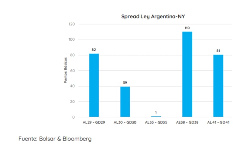 Dado el trato igualitario que se le dio a la deuda local y a la deuda de ley NY y teniendo en cuenta los próximos compromisos de pago que recién serán en 2024, el diferencial por legislación es bajo respecto de los momentos de mayor estrés que se llegó a ver antes del acuerdo de la deuda, cuando supo tocar 600 puntos básicos.