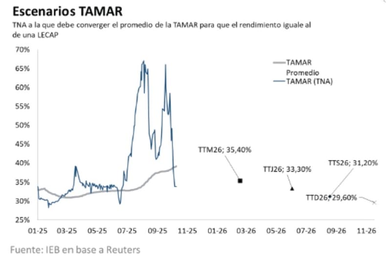 “Seguimos prefiriendo TTM26 a T13F6 debido a que la TAMAR BE permanece en torno a 35,2%; y dado que actualmente devenga una tasa de 38%, la caída de la TAMAR debería ser extremadamente fuerte”, detallaron.
