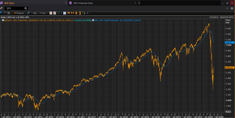 Lo que muestra el grafico es que el índice S&P 500 tuvo un movimiento casi lineal, prácticamente sin evidenciar un movimiento serruchado. Además, los precios se distanciaron de su promedio de 50 días de una manera nunca vista en la historia. Incluso con el rebote existe un distanciamiento significativo.