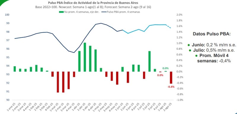 Indicaron que el retroceso de la economía acumulado en dos semanas de julio y dos primeras de agosto "se suma a una dinámica errática en lo que va de 2025: tras un inicio de año con señales de crecimiento, marzo registró una fuerte caída (-2,3%), seguida por un rebote en abril (+3,5%) y nuevas contracciones en mayo (-0,8%). Junio (+0,2%) y julio (+0,5%) mostraron leves recuperaciones, pero sin consolidar una tendencia sostenida".