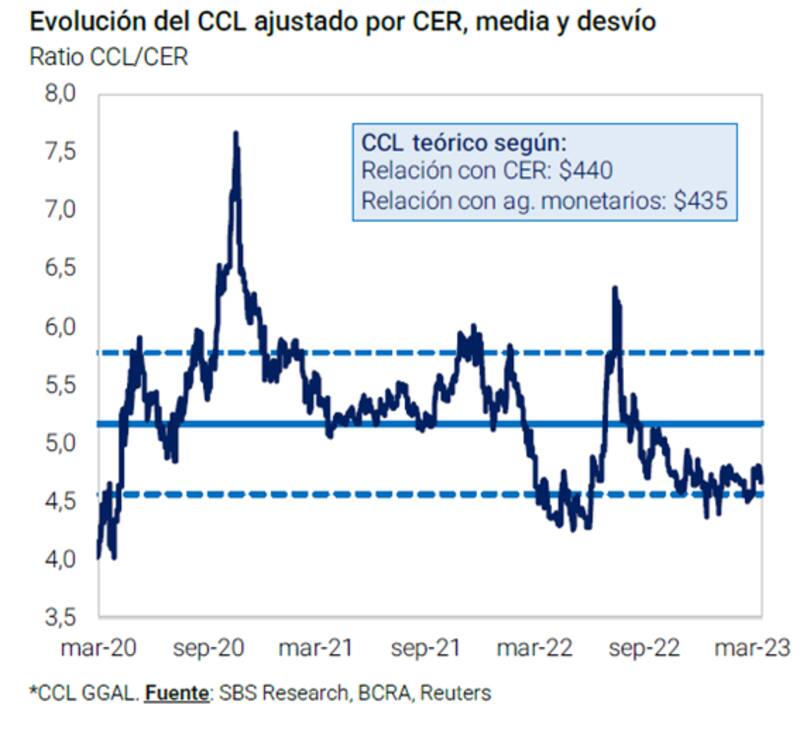 Los analistas de Grupo IEB estiman un valor de referencia para el CCL de $441 frente a un valor de $391 observado actualmente, lo que implica un preocupante desvío de 12,7%.