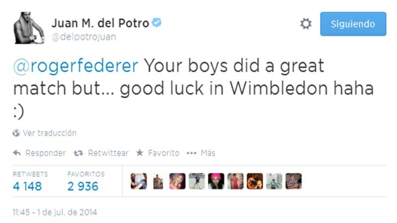 El sentido del humor de Juan Martín del Potro es conocido en todo el mundo del tenis. Y también la excelente relación que tiene con Roger Federer, así como con Rafael Nadal. Por eso, con el suizo se permitió un chiste ni bien terminó el partido en el que la Argentina le ganó a los helvéticos por 1 a 0. En twitter, “Delpo” le dijo en inglés a Roger: “Tus muchachos hicieron un gran partido, pero ... buena suerte en Wimbledon haha :)”.