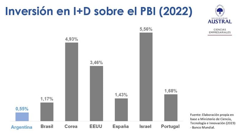El estudio revela que, mientras países como Israel (5,56% del PBI); Corea (4,93%); Estados Unidos (3,46%); Portugal (1,68%); y España (1,43%) han aumentado levemente su inversión en I+D respecto al año 2021, Argentina no logró alcanzar el 1%, una meta del segundo gobierno de Cristina Kirchner. Esta comparación internacional sitúa a Argentina en una posición desfavorable no solo frente a sus vecinos regionales, sino también frente a países fuera de la región.