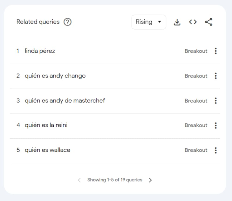 La gente recurre a Google para ponerle nombre y apellido a figuras que acaban de conocer. La búsqueda "quién es andy chango" y "quién es andy de masterchef" demuestra que un programa de alta audiencia es capaz de generar un interés de Breakout inmediato por sus participantes.