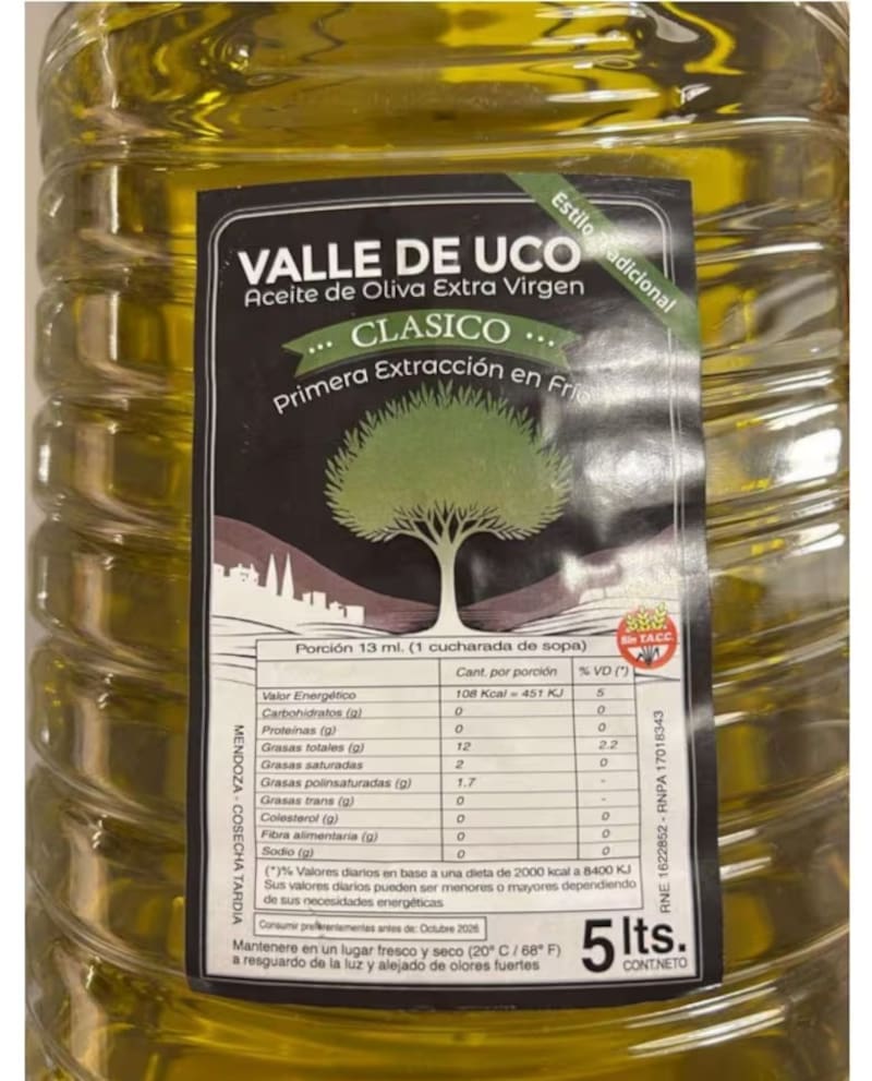 La segunda marca es el aceite "Valle de Uco", en el cual se detectó que poseía una leyenda de "Sin T.A.C.C" sin la autorización correspondiente, por lo que implicaba un riesgo para la salud de los consumidores.