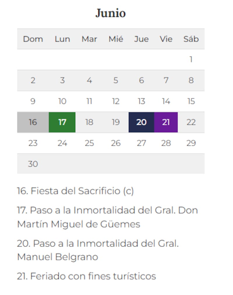 - Viernes 21 de junio: feriado con fines turísticos (fin de semana largo)