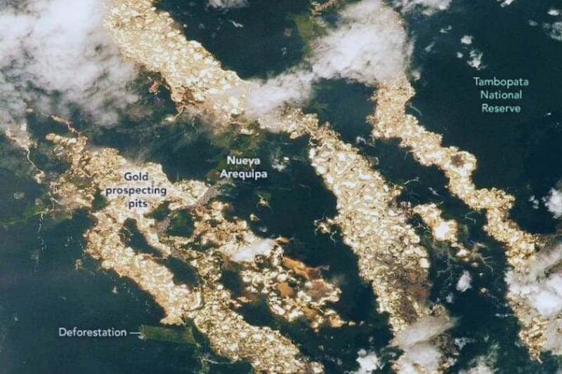 La fiebre del oro está más viva que nunca. Recientes imágenes tomadas por la Estación Espacial Internacional y difundidas por la NASA, muestran ríos de oro que atraviesan la selva amazónica de Perú, en donde el metal precioso destaca por su brillo visible desde el espacio.