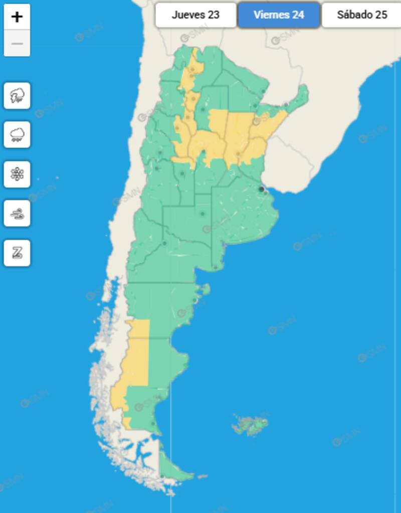 El Servicio Meteorológico Nacional emitió una alerta amarilla para 10 provincias del centro y del norte de Argentina, debido a la presencia de fuertes tormentas para este viernes 24 de enero.