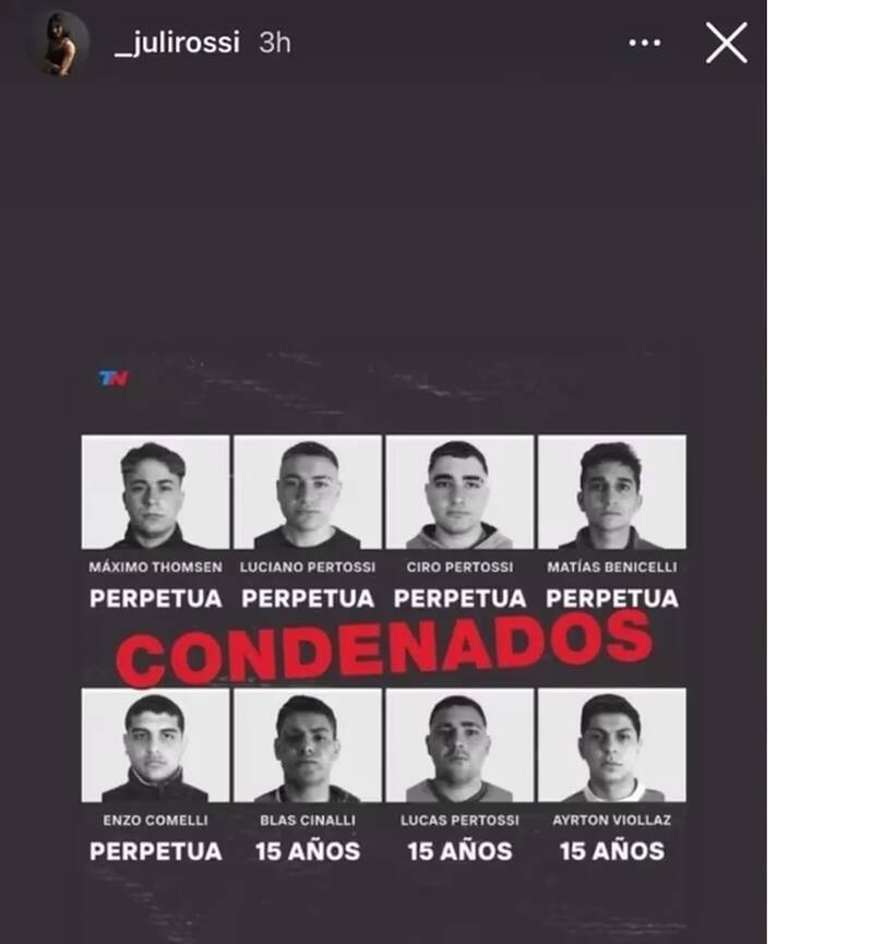 Cinco de los 8 rugbiers acusados fueron condenados a prisión perpetua, mientras que los otros tres recibieron una sentencia de 15 años. Tras conocerse el fallo, Julieta utilizó Instagram para expresar su dolor.