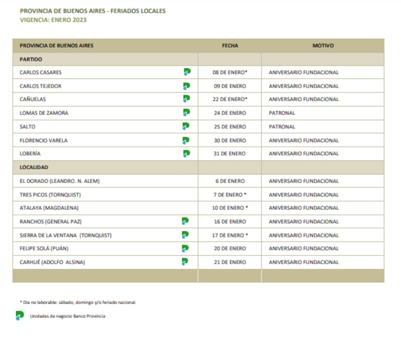 Las jornadas, que sumarán un total de 14, tendrán lugar en el marco de distintos aniversarios fundacionales y patronales, según la información que se desprende el documento elaborado por el Banco Provincia de Buenos Aires (BPA).