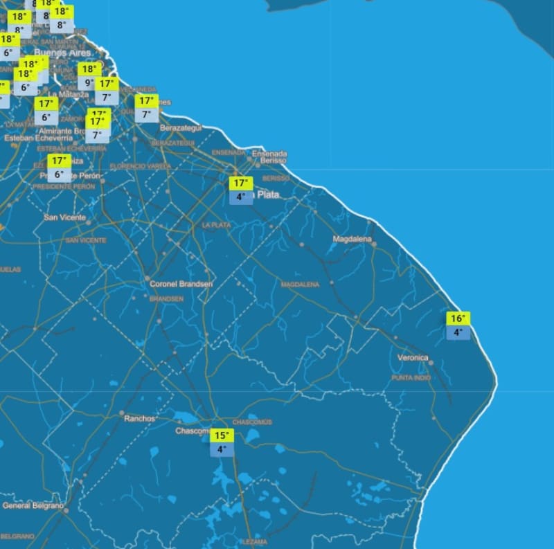El pronóstico se extenderá a otras localidades orientadas al sur de la provincia como Chascomús, Dolores, Punta Indio y toda la Costa Atlántica.