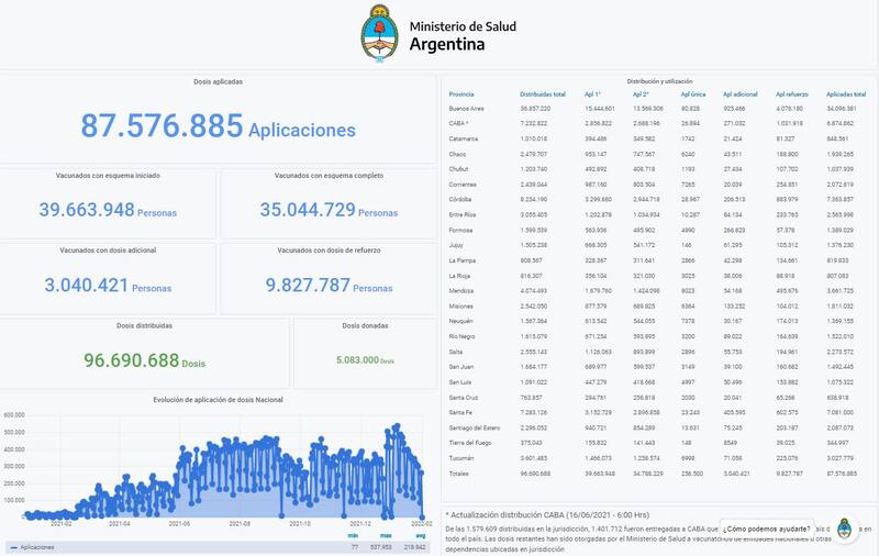 Mientras tanto, el Gobierno avanza con la aplicación de la tercera dosis de la vacuna contra el Covid-19: de acuerdo a los datos del Monitor Público de Vacunación, hasta este martes habían sido inmunizadas 12.868.208 personas con la dosis de refuerzo (aproximadamente el 28% de la población objetivo).
