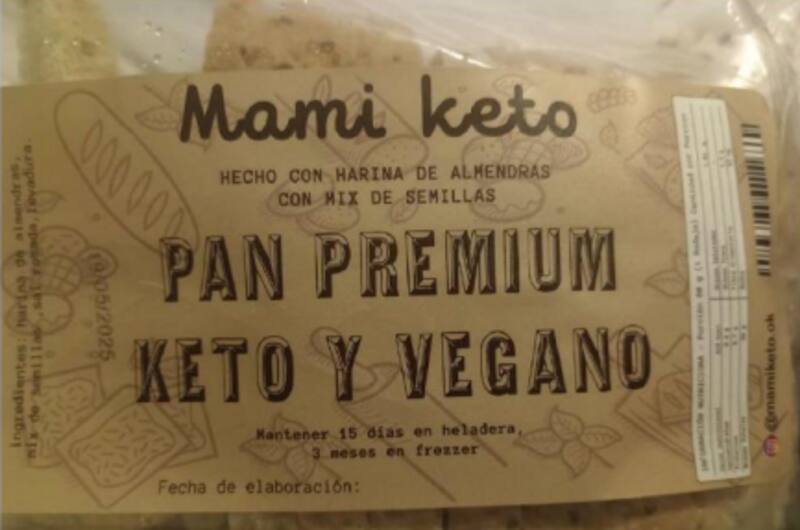 "Pan premium keto y vegano 750g, hecho con harina de almendras y mix de semillas, marca Mami Keto - alimento saludable. Fecha de elaboración: 19/5/2025. Fecha de vencimiento: mantener 15 días en heladera y 3 meses en freezer".