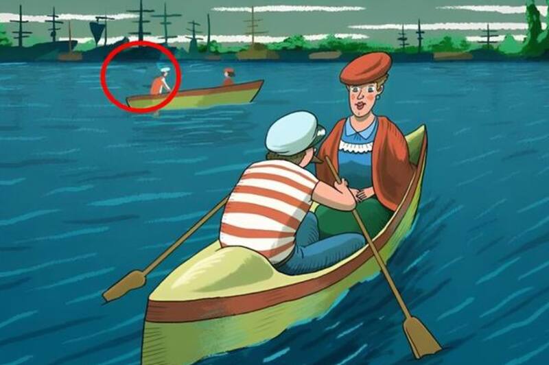 En el siguiente dibujo verás dos canoas con dos personas en cada una de ellas. Hay una que se ve con más detalle que la otra. En la imagen, donde también hay agua, árboles, otros botes y el cielo de fondo, hay un rostro oculto.