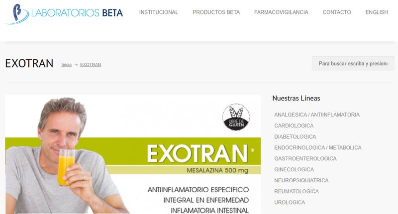 El fármaco afectado es Exotran, certificado REM N° 53.080, fabricado por Laboratorios Beta S.A. (CUIT N° 30-50152188-0). Se trata de un antiinflamatorio indicado para el tratamiento de la fase aguda y para la prevención de las recidivas de colitis ulcerosa, enfermedad de Crohn, protosigmoiditis, rectocolitis hemorrágica y proctitis.
