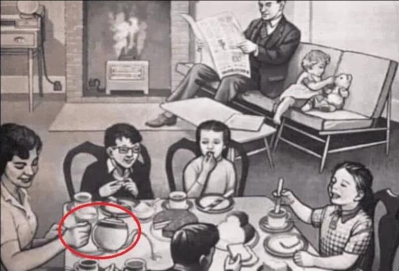 El error se encuentra en la mujer que tiene la tetera en la mano. Ella está sirviendo té a la nada, ya que no hay una taza debajo. ¿Lo llegaste a ver?