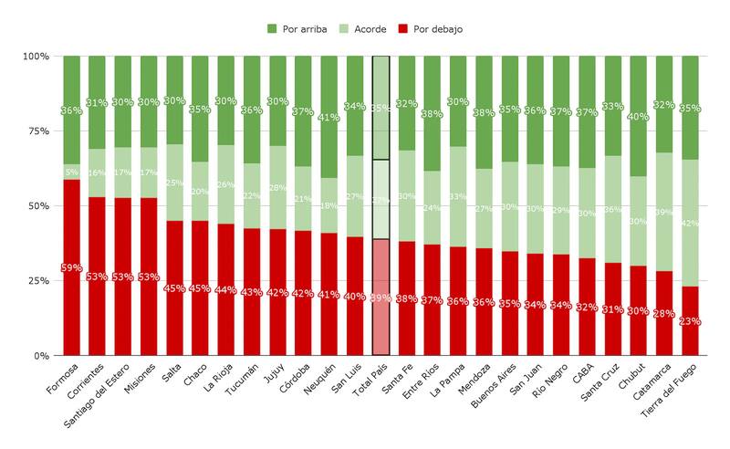 Las provincias con mayor proporción de escuelas que superan las expectativas según su contexto son: Neuquén (41%), Chubut (40%), Entre Ríos (38%) y Mendoza (38%). En contraste, Formosa (59%), Corrientes, Santiago del Estero y Misiones (53%) concentran más escuelas con resultados por debajo de lo previsto.