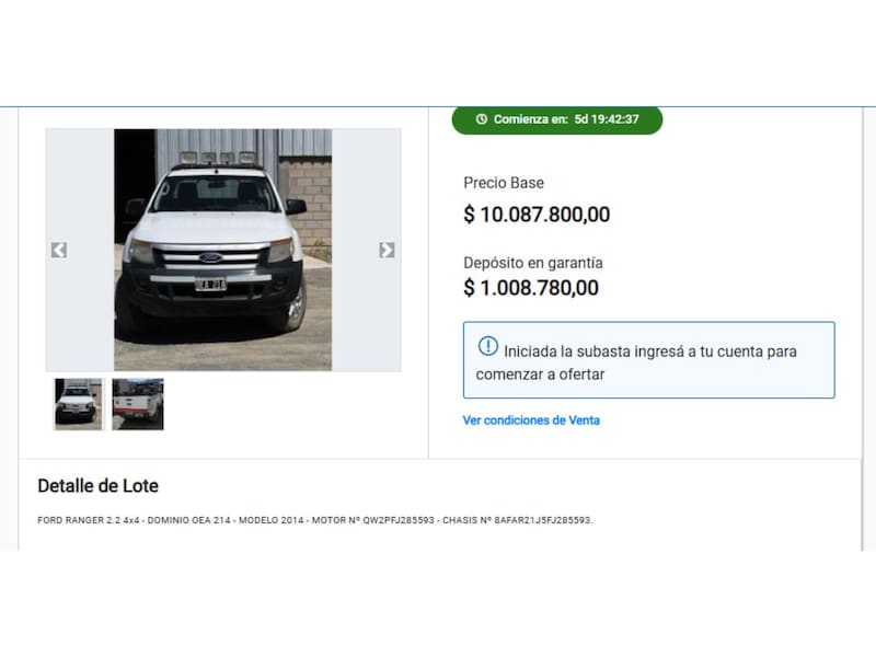 - Ford Ranger XLS 3.2 4x4 2014: $ 5.043.900 (dos unidades)