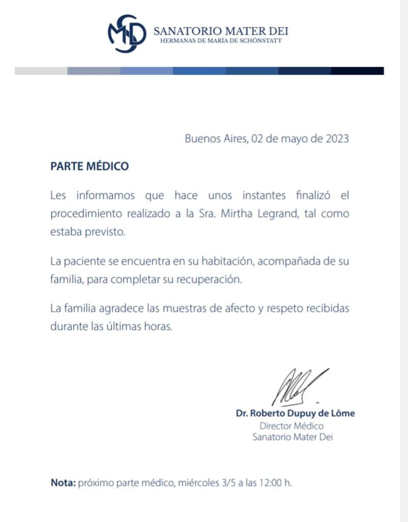 "Les informamos que hace unos instantes finalizó el procedimiento realizado a la señora Mirtha Legrand, tal como estaba previsto. La paciente se encuentra en su habitación acompañada de su familia para completar su recuperación. La familia agradece las muestras de afecto y respeto recibidas durante las últimas horas", señala la comunicación firmada por el doctor Roberto Dupuy de Lome.