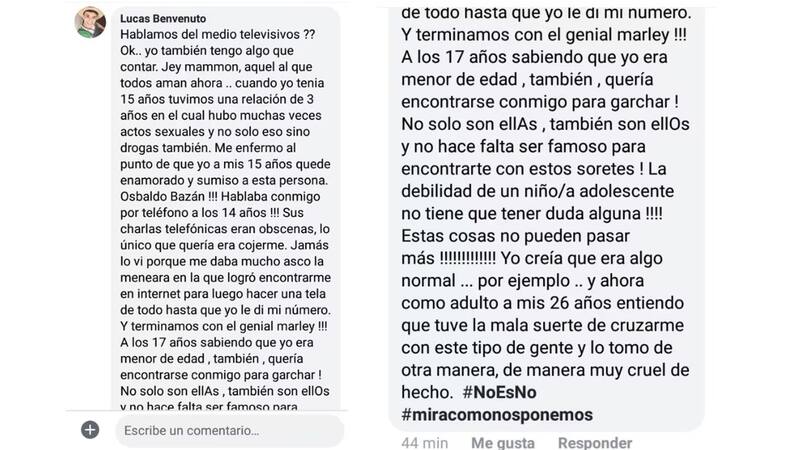 Además, se filtró un antiguo posteo de Lucas Benvenuto donde ya contaba los violentos episodios de presunto abuso sexual que vivió, desde los 14 hasta los 17 años, donde habrían participado hombres del mundo del espectáculo.