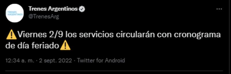 "Viernes 2 de septiembre los servicios circularán con cronograma de día feriado", comunicó la empresa desde su cuenta de Twitter. Hasta el momento no notificaron sobre cambios en servicios de larga distancia.