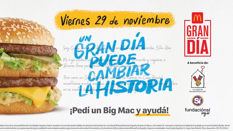 McDonald's anuncia la edición anual de Gran Día, su jornada solidaria más importante que se llevará a cabo el 29 de noviembre en todos los locales del país. El 100% de lo recaudado por la venta de cada Big Mac será donado a Casa Ronald y a Fundación SÍ.