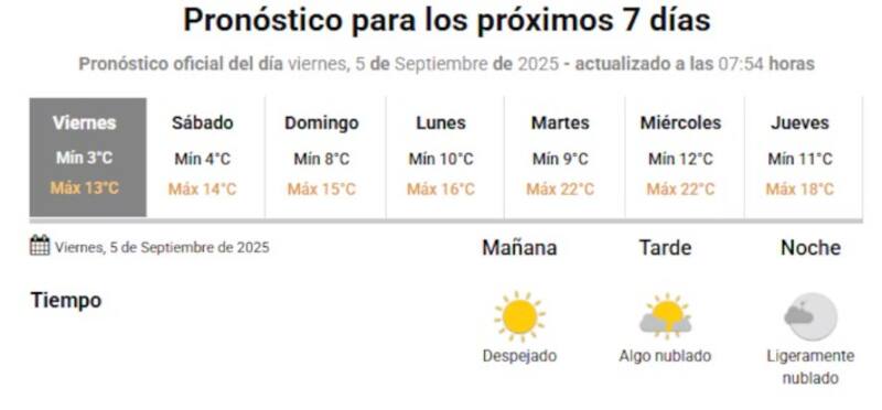 El domingo tendrá un cielo algo nublado en la mañana y una cobertura mayor a partir de la tarde. La mínima será de 8 grados, mientras que la máxima alcanzará los 15 grados.