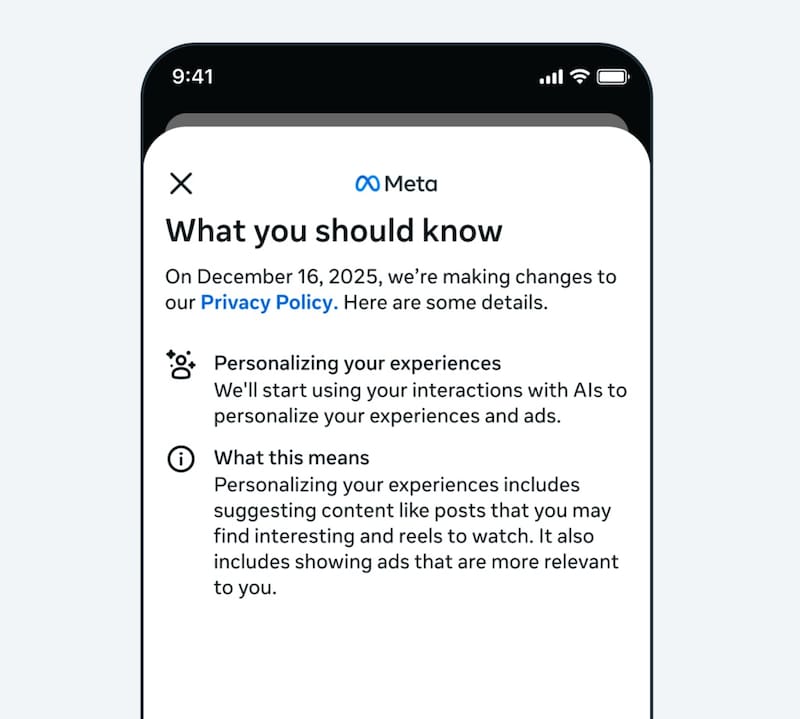 A partir del 16 de diciembre de 2025, la compañía comenzará a utilizar las interacciones de los usuarios con sus funciones de inteligencia artificial, incluyendo Meta AI, para mejorar las recomendaciones de contenido y anuncios en Facebook, Instagram, WhatsApp y otras aplicaciones.