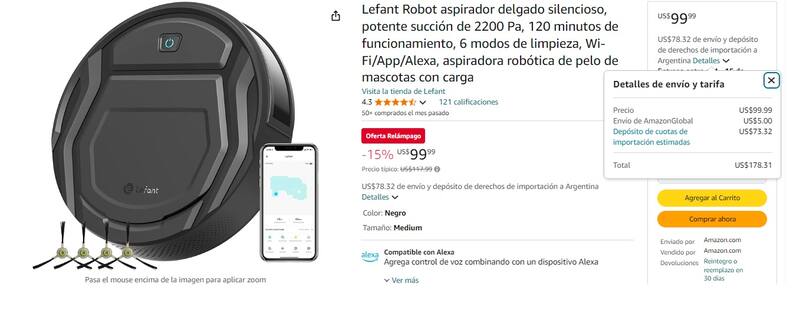 En segundo término, aparece la aspiradora robot de la marca Lefant, que alcanza un valor final de u$s 178,31 (cerca de $ 220.000). No obstante, en el mercado argentino tiene un costo aproximado de entre $ 700.000 y $ 900.000.