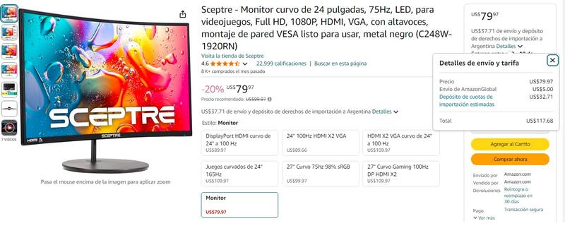 En cuarto lugar, se encuentra el monitor "Sceptre" de 24 pulgadas, el cual es ideal para los amantes de los videojuegos. En Amazon, su precio es de u$s 117,68, lo que se traduce en $ 143.000, mientras que en plataformas locales supera los $ 600.000.