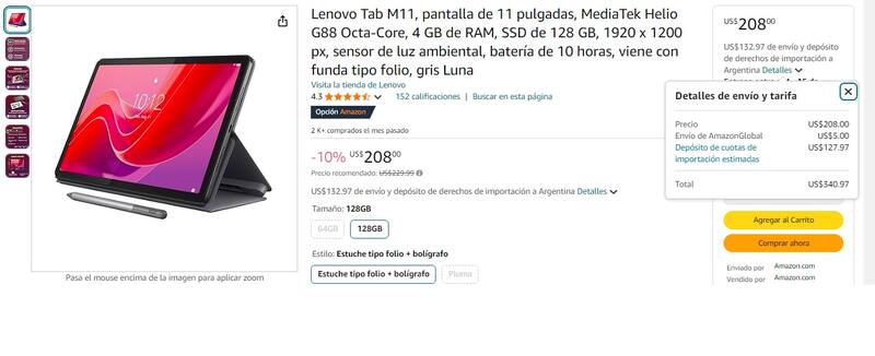 Por un lado, según un relevamiento de El Cronista, la Lenovo Tab M11 tiene un costo total de u$s 340,97, lo que equivale alrededor de $ 415.000 según la cotización del dólar blue($ 1.220). En cambio, en diferentes marketplaces de Argentina se ubica por encima de los $ 520.000.