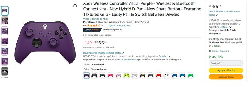 Otra alternativa que ofrece la plataforma es el Xbox Wireless Controller -joystick de Microsoft- a un precio final de u$s 101,31 (aproximadamente $ 120.000). En paralelo, algunos comercios argentinos lo venden por encima de los $ 160.000 (en cuotas sin interés).