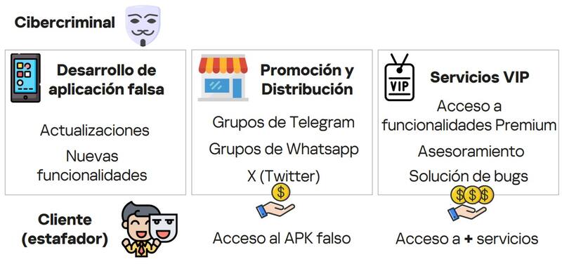 La promoción y distribución de las apps falsas se realiza, según detectó Kaspersky, mediante grupos de Telegram, WhatsApp o alguna otra red social como X. A través de estos canales, la app falsa se vende, usualmente en formato APK.