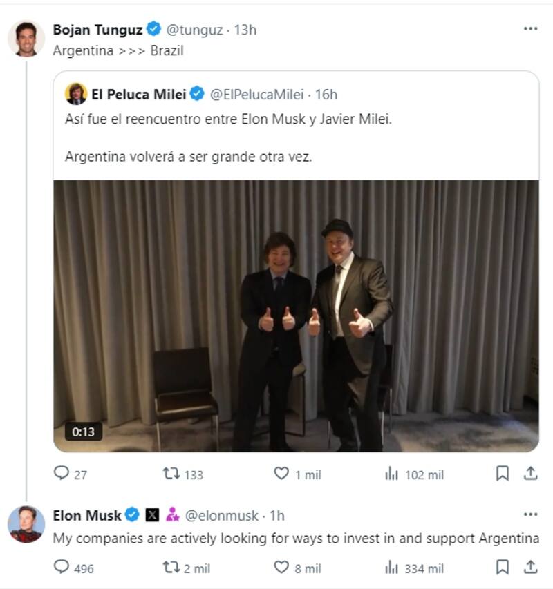 "Mis empresas están buscando activamente formas de invertir y apoyar a la Argentina", dijo Elon Musk.