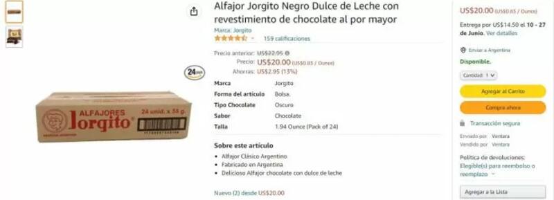 Por ejemplo, en Amazon se puede encontrar cajas de 24 alfajores por unos u$s 20 lo que en valor blue representa unos $ 4000. Mientras que en el mercado local se consiguen por entre $900 y $1200.