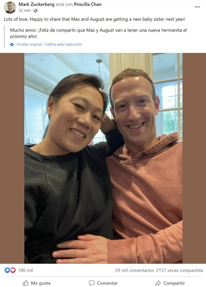 "Con mucho amor les comparto que Max y August (sus hijos) van a tener una nueva hermanita el próximo verano", compartió Zuckerberg junto a una foto con su esposa Priscilla Chan.
