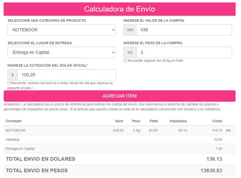 La empresa, para ejemplificar esto, ofrece un sistema en su sitio web que funciona como "calculadora" para saber cuál es el precio final que se terminará pagando. El usuario coloca los productos que se quieren comprar, el costo, el precio, a dónde se realiza el envío, el peso del mismo y la cotización del dólar oficial del día sin ningún impuesto y la calculadora reflejará el costo final. "Siempre a dólar oficial", acotan desde la empresa.