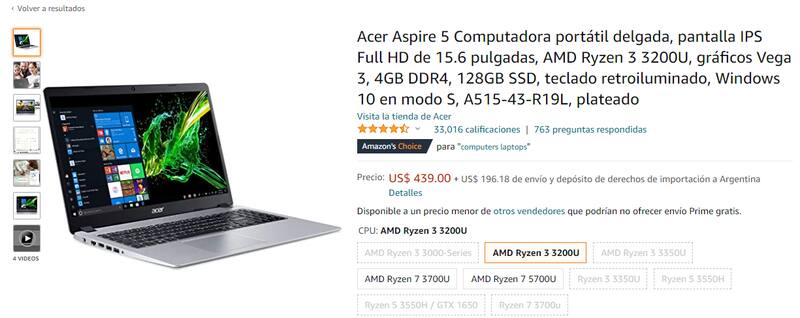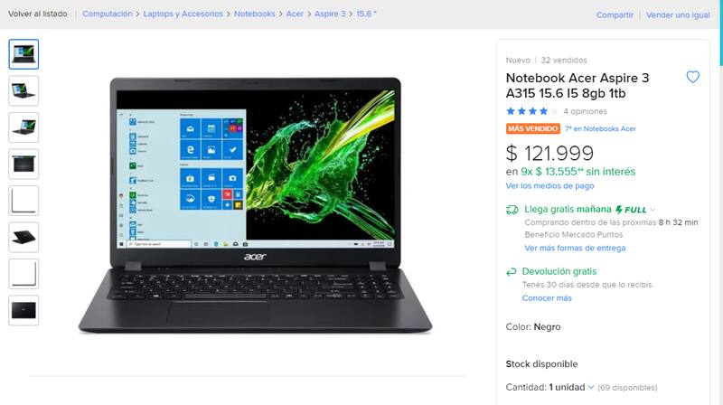 El atractivo de los precios no es menor. Por ejemplo, una notebook Notebook Acer Aspire 3 A315 se consigue en Mercado Libre por $122.000. Pero se puede importar por un precio menor.