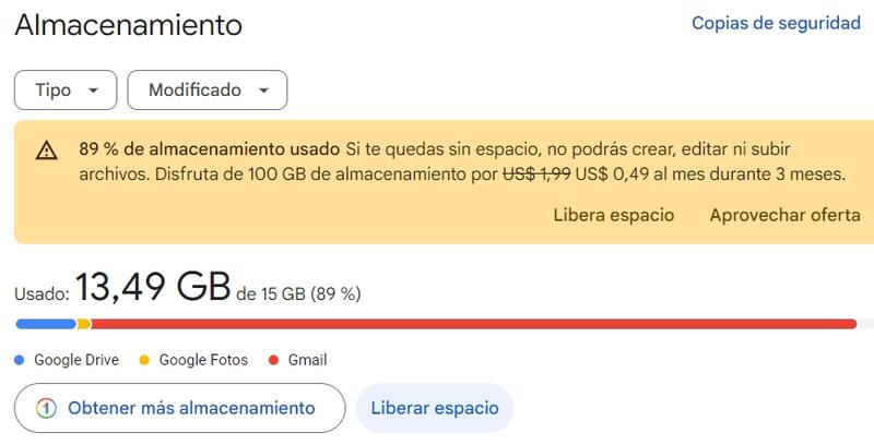 Desde Google Drive se puede gestionar el almacenamiento de la cuenta de Google, lo que puede resultar en una mejoría en el espacio disponible en Gmail.