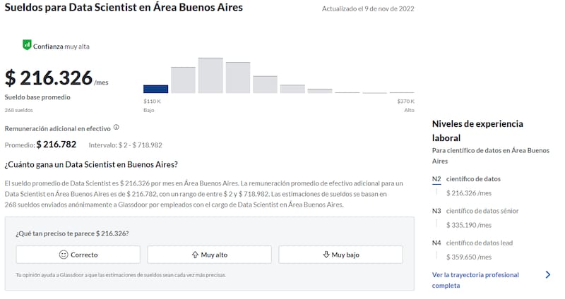 Por último, un especialista en Data Science gana aproximadamente $ 220.000 al mes en promedio y puede llegar a doblar su sueldo con adicionales según el portal especializado.