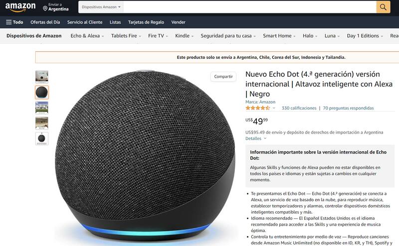 Por último está el asistente virutal de Amazon, el Echo Dot de cuarta generación, que en Argentina suele tener un precio superior a la media ya que solo se consigue por medio de importaciones.
