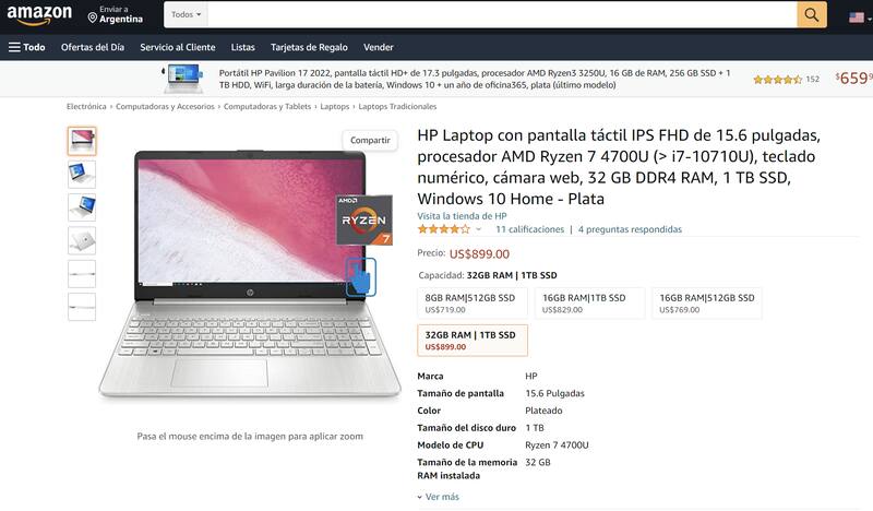 Según se puede ver en sus especificaciones, es un portátil con un procesador AMD Ryzen 7 4700U, una pantalla táctil de 15,6 pulgadas, 32 GB de RAM y 1 TB de disco sólido SSD el cuál se puede comprar por Amazon a un precio de u$s 900.