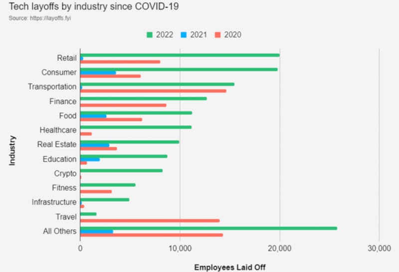 Cabe destacar que no se trata exclusivamente del sector tecnológico. La ola de despidos afecta a todos los sectores que contratan empleados relacionados con la tecnología: retail, transporte, finanzas, criptomonedas, turismo y la lista sigue.